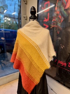 Chustę wydziergałam z trzech motkow Fantastico Lane Mondial i Harmony Lana Gatto , druty 4